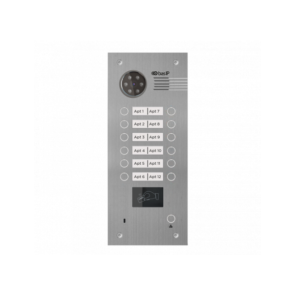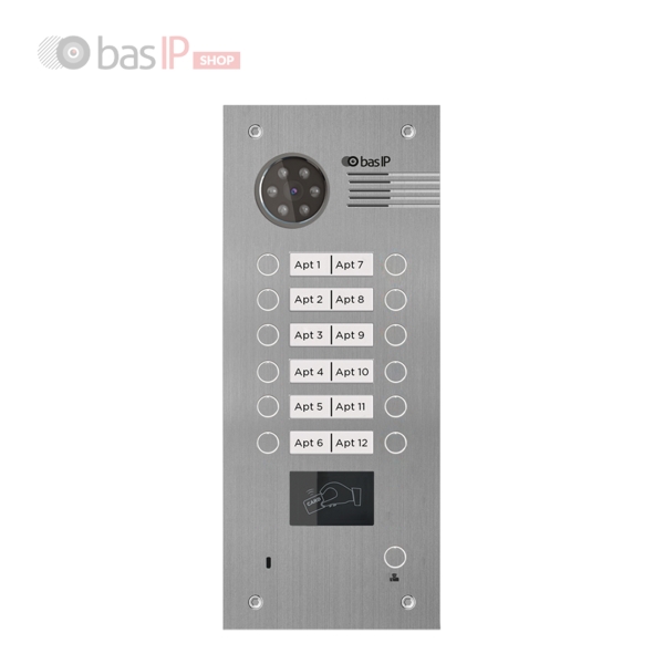 Многоабонентская вызывная панель BAS-IP BA-12B - это прекрасный выбор для тех, кто задумался об установке вызывной панели в небольшом офисном центре до 12 офисов, многоквартирном доме, таунхаусе или же дуплексе. Врезной/накладной монтаж. Поддержка технологии "UKEY": считывание карт и брелоков и мобильных идентификаторов по стандартам EM-Marin, Mifare® Plus и Mifare® Classic, Bluetooth, NFC. Цветная IP камера 1.0 Мп. Возможность поворота камеры ± 15°. Степень защиты IP65. Температурный режим: -40 до + 65 °C. Отдельная кнопка вызова консьержа. Питание + 12 В/PoE. Поддержка SIP P2P, Выход Wiegand 26,32,34,37,40,42,56,58,64, RS485. Цвет - серебро.