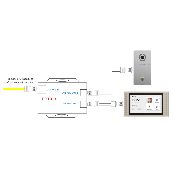 к себе вызывную панель и монитор на "Выходы 1 и 2", а приходяший кабель от общедомовой системы на "Вход".